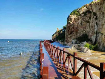 望海長廊,距鷹角亭50米,廊長70米。游人逗留廊中,遠(yuǎn)眺渤海碧波,白云沙鷗,帆船巨艦;近賞淺水明澈,微波清蕩,看拾貝之人歡笑,聽大海之波濤,令人流連忘返。海邊建“浴日亭”,其匾額為嚴(yán)濟(jì)慈先生所寫。廊中彩繪雕梁畫柱,栩栩如生。兩側(cè)是由方亭和八角亭組成,分別采用了古代園林常見構(gòu)景手段—借景和透景的方法,吸收了北京頤和園和承德外八廟長廊的特點(diǎn),繪畫了北戴河24景和北戴河206個(gè)民間故事傳說,以花鳥、魚蟲、人物等不同圖案,這種彩繪叫做“蘇式彩繪”。高于蘇式彩繪的要屬“旋子彩繪”畫面用簡化式的渦卷瓣旋花,有時(shí)也可以畫龍鳳,一般用于次要宮殿式寺廟中。等級最高的彩繪要屬“和璽彩繪”。中間的畫面由不同的龍或鳳的圖案組成,間補(bǔ)以花卉圖案,金碧輝煌,十分壯麗。 |
