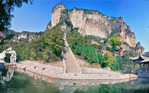 抱犢寨風(fēng)景名勝區(qū)是國(guó)家AAAA景區(qū),位于河北省石家莊市鹿泉市境內(nèi),距石家莊市16公里,距首都北京288公里。抱犢寨,舊名抱犢山,古名萆山,是一外集歷史人文和自然風(fēng)光為一體的名山古寨。它東臨華北平原,西接太行群巒,一峰突起,崢嶸雄秀,四周皆是懸崖絕壁,遠(yuǎn)望猶如巨佛仰臥,眉目畢肖。山頂平曠坦夷,有良田沃土660畝,土層深達(dá)66米,異境別開,草木繁茂,恍如世外桃源。有“天下奇寨”、“抱犢福地”、“全國(guó)最大山頂園林”等美譽(yù)。其景點(diǎn)均集中在寨頂平臺(tái)之上,有全國(guó)最大的山頂門坊南天門、道教宮觀金闕宮、全國(guó)最大的山頂?shù)叵率裎灏倭_漢堂、華夏第一龍壁千龍壁以及牛郎織女故事的發(fā)祥地——牛郎織女家、天池、天堂街、環(huán)山長(zhǎng)城等諸多景點(diǎn);公元前204年漢將韓信曾于此萆山設(shè)伏、背水一戰(zhàn)、大破趙軍,因而寨頂建有韓信點(diǎn)將臺(tái)和韓信祠。金末元初,金恒山公武仙曾于此山屯兵建寨,抗擊蒙古軍隊(duì)。在道教典籍中,該山被列為“北岳佐命”,明代著名道士張三豐也曾游歷此山,留下了“三豐派”一支脈,至今相傳不絕,宮觀猶存。近年來,景區(qū)大力實(shí)施升級(jí)改造工程,重修了登山路;開發(fā)建設(shè)了以音樂噴泉、讀月臺(tái)、天井飛瀑、彩虹谷、思凡亭等景點(diǎn)為主的鹿隱源生態(tài)新區(qū)。并增加了具有鮮明特色的少數(shù)民族歌舞演出,景區(qū)魅力倍增。
