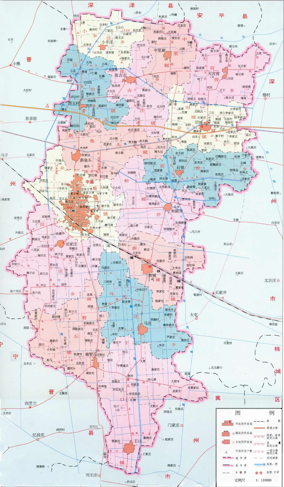 鎮(zhèn):辛集鎮(zhèn)舊城鎮(zhèn)、張古莊鎮(zhèn)、位伯鎮(zhèn)、新壘頭鎮(zhèn)、新城鎮(zhèn)南智丘鎮(zhèn)、王口鎮(zhèn)