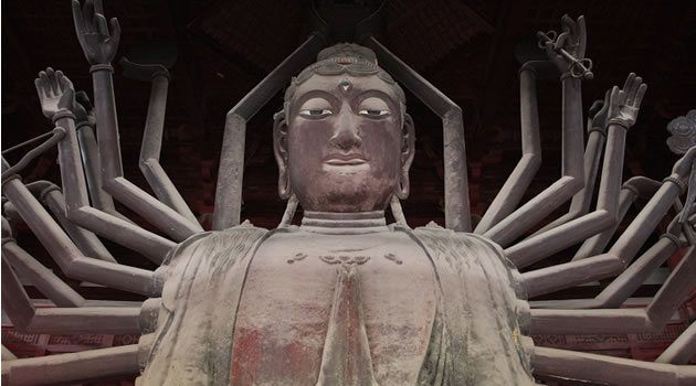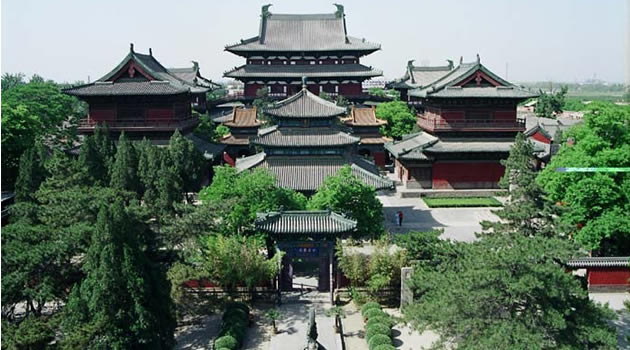 隆興寺:位于石家莊市正定縣縣城,是國內(nèi)現(xiàn)存時(shí)代較早、規(guī)模較大而又保存完整的佛教寺院之一。隆興寺始建于隋開皇六年(586年),原名“龍藏寺”。宋初,太祖祖趙匡胤敕令在龍藏寺內(nèi)鑄造銅佛,并蓋大悲閣,遂大興土,以大悲閣為主體的一組宋代建筑先后告成。到了清康熙、乾隆年間,又兩次大規(guī)模維修和增建,寺院發(fā)展到鼎盛時(shí)期。清康熙四十八年(1709),改龍藏寺為隆興寺,俗稱大佛寺。 隆興寺這座千年古剎,歷代帝王曾多次到此巡境幸駐蹕,上香禮佛,題詩書匾,刻碑立石。可見當(dāng)年這里晨鐘暮鼓,鐘磬齊鳴,香煙繚繞,“南無”聲聲的歷史盛況。大悲閣是隆興寺的主體建筑,五檐三層,高33米。閣內(nèi)正矗立著高大銅佛鑄像,這就是名聞遐邇的正定大菩薩。這尊千手千眼觀音菩薩像有22.28米高,有42臂分別執(zhí)日、月、凈瓶、寶杖、寶鏡、金剛杵等法器。面部情端祥恬靜,仁慈莊重。達(dá)到了瞻之彌高、仰之益恭的藝術(shù)效果。