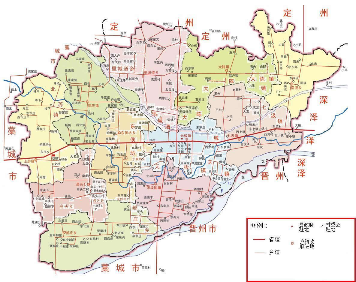 鎮(zhèn):無極鎮(zhèn)七汲鎮(zhèn)、張段固鎮(zhèn)、北蘇鎮(zhèn)、郭莊鎮(zhèn)大陳鎮(zhèn)