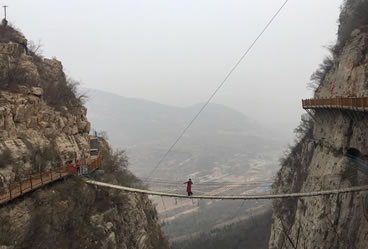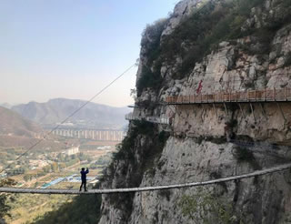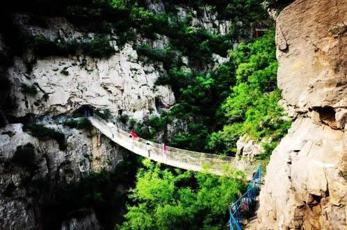 佛爺洞與七星洞有一峽谷相隔,景區(qū)開發(fā)者便凌空架起一道35米開的鐵索橋,把天塹變?yōu)橥ㄍ臼箖啥聪噙B,人踏鐵索橋一步九顫蕩悠悠,頓生“大渡橋橫鐵索寒”之感。不過,這里的鐵索橋絕對(duì)安全,被人譽(yù)為“冀南一絕有驚無險(xiǎn)”是游人獵奇探險(xiǎn)鍛煉意志和膽量的絕佳場(chǎng)所。