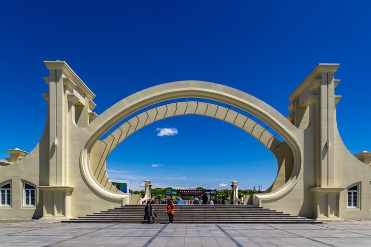太陽(yáng)島大門即太陽(yáng)之門,坐落在太陽(yáng)島西部主入口處。太陽(yáng)門全長(zhǎng)68米,兩端向太陽(yáng)石方向環(huán)抱,主門高12.03米。大門為一大四小五個(gè)橢圓拱型門相連組成,其造型以新藝術(shù)運(yùn)動(dòng)風(fēng)格的建筑語(yǔ)言為主,并揉以其他風(fēng)格的藝術(shù)語(yǔ)言,其創(chuàng)意主題為“太陽(yáng)的窗口”。中間的拱型大門和太陽(yáng)島巨石在同一中軸線上,行進(jìn)方向?yàn)檎龞|正西,由此可以面向日出日落,四座小拱門中矗立著四座雕塑。門前的巨石,坐落在光輝四射的太陽(yáng)圖案中心,腳下是模擬的哈爾濱市街區(qū)圖。