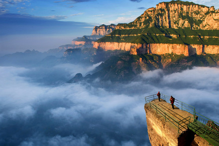 云峰畫廊是一條畫廊式的風(fēng)光帶,位于老爺頂?shù)陌肷窖汕宸尻P(guān)起,環(huán)周8千米,終點又回到清峰關(guān)。它依附老爺頂,連接豫晉關(guān),遙望十字嶺,擷取太行山的精華,依山順勢建造了7個位置極佳的觀景臺,依次為聽禪臺、試膽臺、如畫臺、戲龍臺、丹鳳臺和歸真臺。