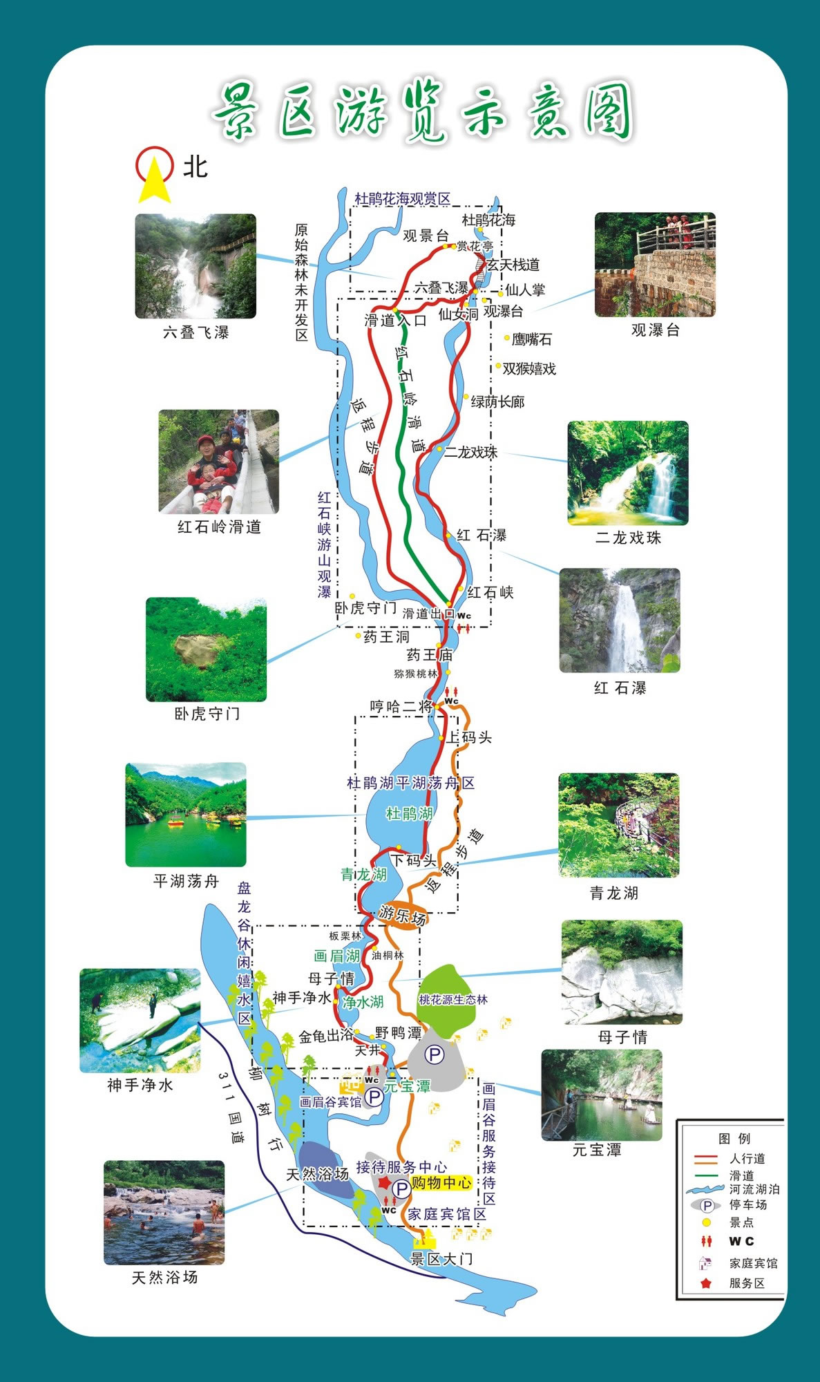 迎賓湖、元寶潭、杜鵑湖、六疊瀑、神手凈水、哼哈二將、紅石峽等