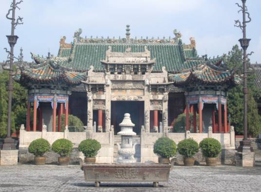 周口關(guān)帝廟,整座建筑群占地20余畝,沿南北中軸線,分三進院落縱深布局,結(jié)構(gòu)嚴(yán)謹(jǐn)。其木雕、石雕、磚雕數(shù)量多,內(nèi)容豐富,工藝精湛,突出反映了清代中晚期那種追求精雕細(xì)琢、裝飾華麗的社會風(fēng)尚。建筑裝飾的題材中大量采用了“二龍戲珠”、“鳳凰牡丹”、“五福捧壽”、“加官進爵”、“金玉滿堂”等各種吉祥如意圖案紋飾,是封建社會中傳統(tǒng)倫理道德的形象反映。
