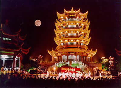 號(hào)稱江南三大名樓之一的黃鶴樓,原址在湖北武昌蛇山黃鶴磯頭,原為辛氏開設(shè)的酒店,一道士為了感謝她千杯之恩,臨行前在壁上畫了一只鶴,告之它能下來起舞助興。從此賓客盈門,生意興隆。過了十年,道士復(fù)來,取笛 吹奏,道士跨上黃鶴直上云天。辛氏為紀(jì)念這位幫她致富的仙翁,便在其地起樓,取名“黃鶴樓”。