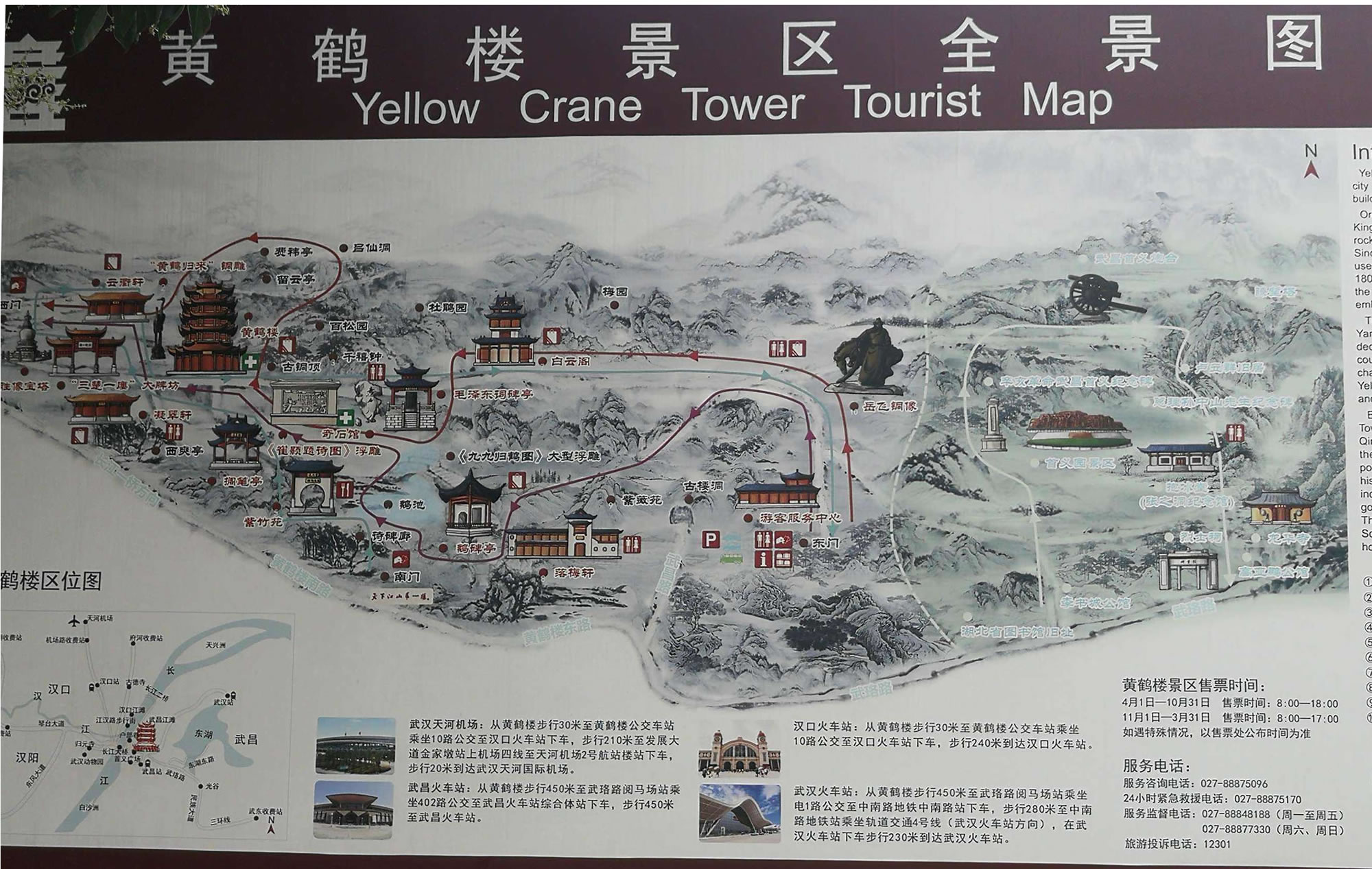 武昌火車站-紅樓-黃鶴樓-龜山電視塔-古琴臺(tái)-武漢客運(yùn)港-八七會(huì)址-濱江公園-解放公園-東湖梨園-鳥語林-省博物館-東湖梅嶺-放鷹臺(tái)-東湖梅園-武漢植物園-東湖釣魚臺(tái)。
