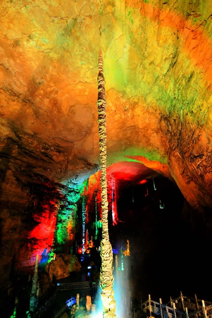 雪松是龍宮的第三大奇觀,也是黃龍洞內(nèi)生長速度最快的一根石筍,它通體雪白,高達17米,巍然聳立在龍宮大廳西端的斜坡上,“大雪壓青松,青松挺且直”就是它的真實寫照!把┧伞钡目茖W(xué)名稱叫棕櫚狀石筍,是洞頂?shù)嗡捌洚a(chǎn)生的飛濺水共同作用的結(jié)果,一般只有在空間較為高大的廳堂才能看到。根據(jù)其根部的棕櫚片取樣分析,“雪松”挺立在這里已經(jīng)有9.6萬年的時間了,因此也叫它“萬歲松”。