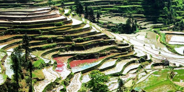 紫鵲界梯田位于新化縣西部山區(qū)水車鎮(zhèn)境內(nèi),她周邊的梯田達8萬余畝以上,其地勢之高,規(guī)模之大,形態(tài)之美,堪稱世界之最。紫鵲界生態(tài)環(huán)境優(yōu)美,梯田密集,形態(tài)原始,阡陌縱橫,線條流暢,山高水長,板屋交錯,充分展示出梯田的自然美、古樸美、形體美、文化美。尤其是隨著四季氣候的變化,使紫鵲界梯田更加婀娜多姿,如臨人間仙境。水奉公路盤旋于這些梯田之間達十余公里,梯田遍布于海拔500米至1000余米的十幾個山頭上,最大的不過1畝,最小的只能插幾十蔸禾,連綿起伏,輾轉(zhuǎn)盤旋,可謂是儀態(tài)萬方,令人贊嘆不已。據(jù)調(diào)查,紫鵲界梯田成型已有2000余年歷史,是苗、瑤、侗、漢等多民族