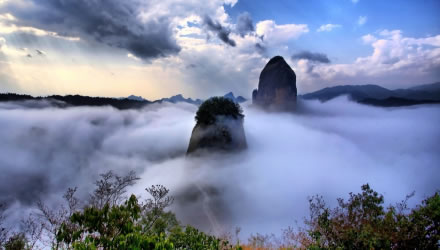 武岡云山,云山,湘西南名山,屬雪峰山余脈,以云多奇幻而得名。位于武岡市城南5千米處,東西綿延數(shù)十里,毗連著武岡、新寧、城步三縣疆界。最高峰海拔1372.5米,為國家級森林公園和國家3A景區(qū)。分伴山?jīng)_、云山堂、紫霄峰幾大景區(qū),景區(qū)中云海、古樹、流泉、溪澗、瀑布、幽谷、山峰、怪石、古剎、靈寺、古道、古跡一應(yīng)俱全,被譽(yù)為"楚南勝地"。始建于三國吳國時勝力寺,寺廟面積2500平方米,寺內(nèi)有彌勒殿、大雄寶殿、觀音殿等,建筑完好,為湘西南著名的宗教文化活動場所和游覽勝地。1982年被列為國家自然保護(hù)區(qū),1992年9月經(jīng)原國家林業(yè)部批準(zhǔn)建立國家級森林公園。