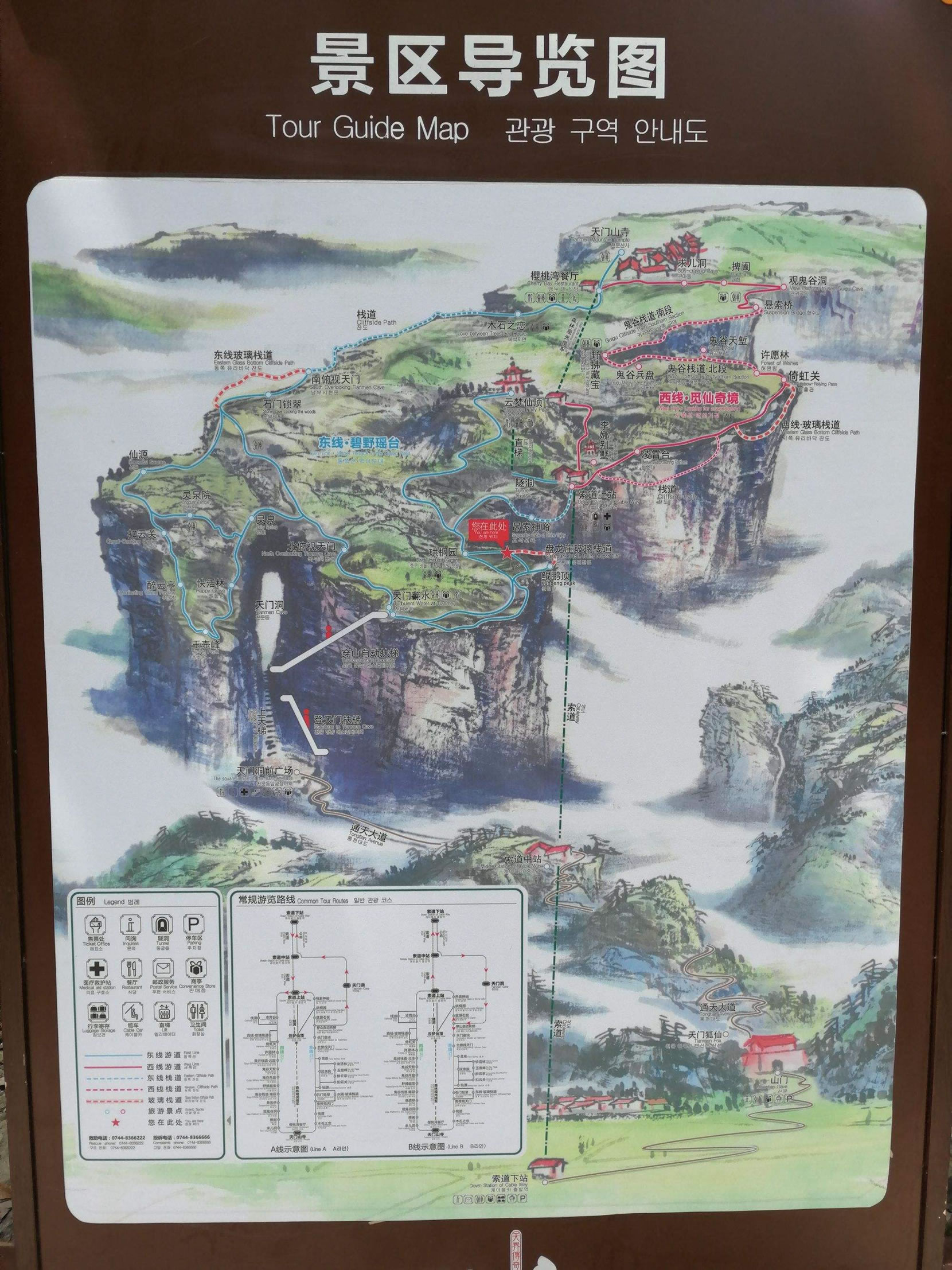 景區(qū)穿山自動(dòng)扶梯開(kāi)通的同時(shí),天門(mén)山景區(qū)也新開(kāi)通AB兩條游覽線路:A線游客乘索道上山,游覽山頂后乘穿山電梯到天門(mén)洞,游覽天門(mén)洞后乘車返回市區(qū)索道下站;B線游客自市區(qū)索道下站乘免費(fèi)班車至天門(mén)洞,乘穿山電梯到山頂,山頂游覽后乘索道返回市區(qū)索道下站。AB兩條游覽路線,同票同價(jià),游客可自愿選擇。 |