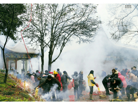 炎帝陵民間祭祀以告祭為主。祭祀時(shí)間多選在每月的初一、十五以及各種節(jié)令、節(jié)慶。此外,每逢炎帝生辰日(農(nóng)歷四月二十六日),炎陵方圓幾百里的群眾都會(huì)匯集于炎帝陵,祭祀炎帝,祈福求平安。民間祭祀儀式有墓前牲祭、上香敬供、跪拜祈福、許愿求應(yīng)、還愿祭拜等等。每年正月,各地民眾爭相在炎帝陵宰殺牲畜,供上果品、美酒,向始祖行三拜九叩之禮,獻(xiàn)香燃炮,傳說這樣就能得到始祖庇佑,一年順順利利,所以每年正月炎帝陵香火尤為旺盛。民間祭祀對祭時(shí)、禮程亦十分講究,通常拜祭始祖前都會(huì)洗梳干凈,行跪拜叩首之拜之祭過炎帝后,將自己的心愿和所求寫于帛或紙是,用線系于小石子等重物一端,拋掛于炎帝陵內(nèi)的古樹上,祈求炎帝保佑愿望實(shí)現(xiàn)。
