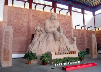 炎帝雕像一手拿谷穗,一手握耒耜,寓意開拓農(nóng)耕文化。雕像高9.7米,座長8.9米,寬4.7米,重約390噸,以紅色花崗石雕制。為福建光澤紅花崗巖雕琢。雕像兩旁立有一對聯(lián)石柱,“到此有懷崇始祖,問誰無愧是龍人”對聯(lián)為李鐸先生書寫。大殿左、右、后三面墻是大型廣東紅砂巖石雕壁畫,畫高5.2-7.9米,總長53米,總面積321平方米,壁畫內(nèi)容為歌頌炎帝十大功德。