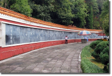 一進(jìn)為午門,拱形石門,高4.0米、寬2.6米,門前為長寬均為50米的朝覲廣場,左右分列為拱形戟門和長方形掖門,門扇均為實(shí)榻大門。進(jìn)午門正中,樹立國家主席江澤民1993年9月4日親筆題寫的“炎帝陵”漢白玉石碑,前嵌盤龍龍陛,取名龍?bào)椿⒕,天下一統(tǒng),江山穩(wěn)固之意。左右分立雄健的山鷹和白鹿花崗石雕。