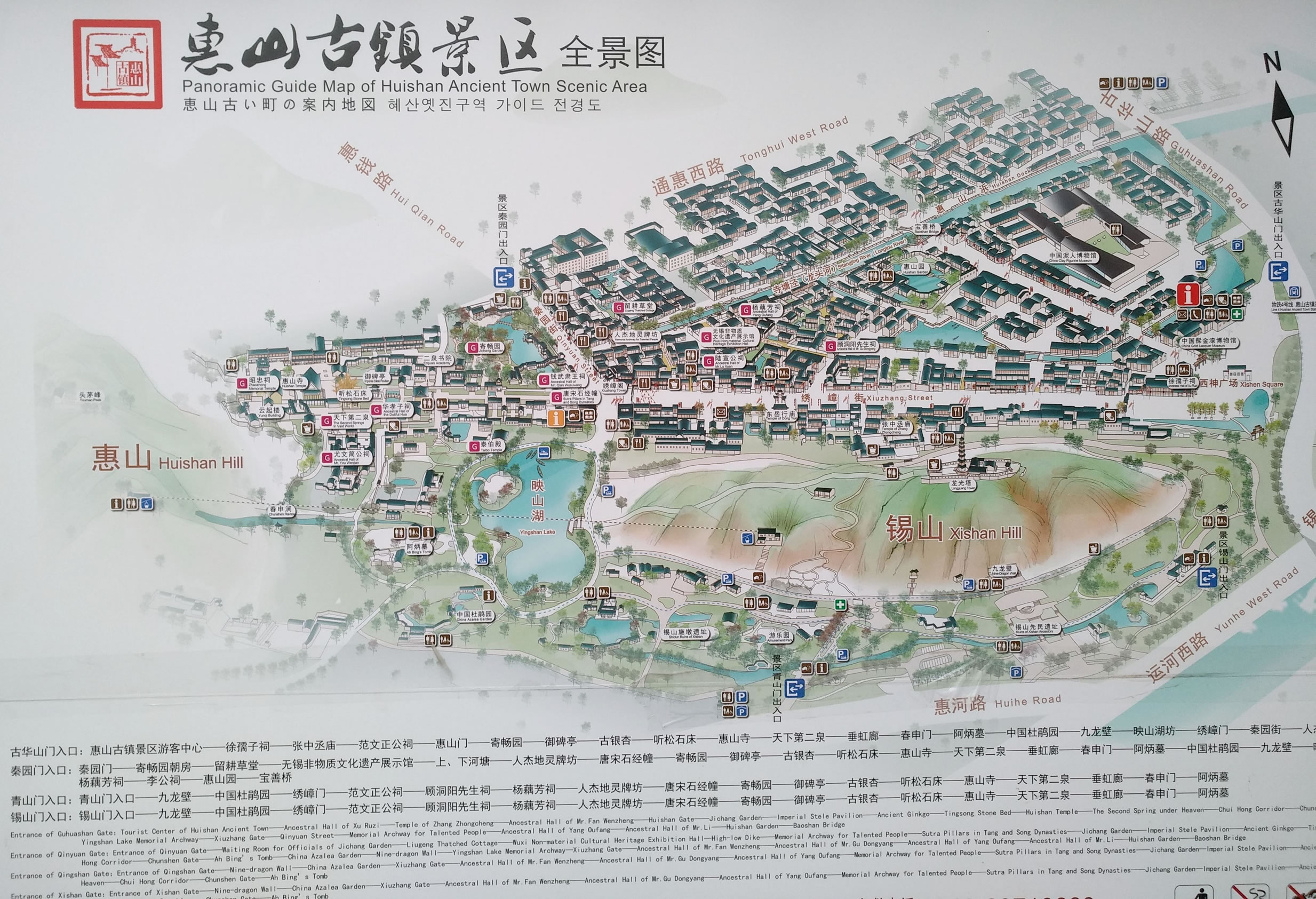 惠山古鎮(zhèn)景區(qū)共有4個(gè)出入口,分別為古華山門入口、秦園門入口、青山門入口、錫山門入口。