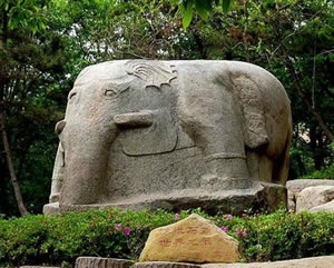 從龍洞西行,在林木掩映的山坡上.屹立著一座碩大的漢代圓雕石象。石象依一塊花崗巖巨石的自然形狀雕刻而成雕刻而成,象身高2.6米,長(zhǎng)4.8米,背寬3.5米,石像耳闊體肥,四肢健壯,長(zhǎng)鼻巨牙、卷尾粗足,形態(tài)雄奇,豐滿肥碩。象身西側(cè)有一高0.88米,寬0.49米,深0.2厘米的陰鑿凹面,系未見刻銘的題榜,象身東側(cè)以陰線刻一高1.13米,寬0.62米的方框,內(nèi)刻隸書“象石”字樣,在刻銘與象前腿之間,還鑿刻了一個(gè)頭梳“丁”字形發(fā)髻,手持勾鞭,腳帶鐐銬高0.92米的馴象奴。象的四足均踏著蓮花,體現(xiàn)了佛教中六牙白象王在水中步步蓮花的故事傳說。它是孔望山漢代佛教造像有機(jī)整體中不可分割的一部分。此石系目前我國(guó)發(fā)現(xiàn)的東漢時(shí)期最大的圓雕石刻,石象南側(cè)約一百五十米處,還有與此同時(shí)期的石雕鎮(zhèn)海蛙,此蛙為當(dāng)時(shí)鎮(zhèn)海之物。體長(zhǎng)240厘米,寬220厘米,通高110厘米,石蛙頭部略損,前兩肢半殘,眼睛陰刻,背上遍刻陰線鱗紋。這兩座石雕,別特是石象,氣勢(shì)雄偉,造型精美。均為我國(guó)珍貴的石刻藝術(shù)珍品。