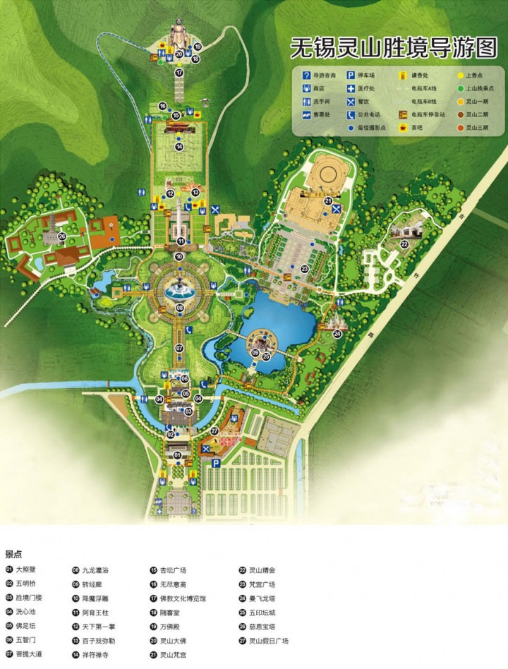 靈山景區(qū)門(mén)樓為城樓式建筑,游客由此入園,即至佛手廣場(chǎng)。佛手廣場(chǎng)建有天下第一佛掌,為大佛右手復(fù)制件,印相為“施無(wú)畏印”,表示除卻眾生痛苦,撫慰眾生心靈。 “好運(yùn)摸佛掌”使人人得以與佛親近,祈佑平安。靈山放生池乃信眾放生之所,體現(xiàn)佛陀好生之德。放生池上有三橋,東為慈恩橋,西為普渡橋,中為大覺(jué)橋,取意為經(jīng)慈恩橋可消災(zāi),過(guò)普渡橋當(dāng)?shù)酶,走過(guò)大覺(jué)橋,眾生當(dāng)收攝身心,步入清涼佛地一祥符禪寺。祥符禪寺始建于唐,傳為玄奘法師賜禪小靈山時(shí)初建,歷宋、元、明、清乃至近代, 已有千余年歷史。祥符禪寺后杏壇廣場(chǎng),古銀杏樹(shù)為小靈山剎僧人手植,老枝蒼虬,春華秋實(shí),至今已有一千三百余歲。杏壇廣場(chǎng)左側(cè)有百年香樟,頂分三枝,酷肖三香,名為“三炷香”;右側(cè)“佛手樟”,頂分五枝,形如佛手。八角井為千年古井,上建有八角龍亭;白蓮池中還生長(zhǎng)著神奇的無(wú)尾螺螄。