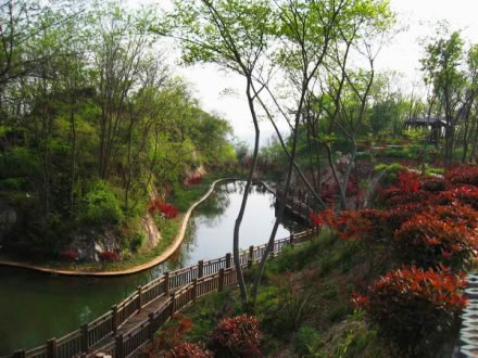 紅葉谷位于御花園和鳳翔峰西南山腰的交界處,由于這里長年無人涉及,加上山水的沖刷,于是巖石裸露處盡顯崖溶奇石景觀,其余則為茂密的叢林和濕地,特有的氣候環(huán)境,使這里奇石嶙峋、古楓矗立、古藤纏繞。該景點的建設(shè)充分考慮倒地貌、水體、植物、設(shè)施等的和諧搭配,注重棲霞山的生態(tài)功能的修復(fù),不斷美化、優(yōu)化、彩化環(huán)境,并引水造池,改善該區(qū)域的生態(tài)環(huán)境。紅葉谷占地約5萬平方米,景區(qū)自然風(fēng)貌優(yōu)美,以奇石、紅葉為特點,是集山、石、水、林、亭為一體新的紅葉觀賞區(qū)。
