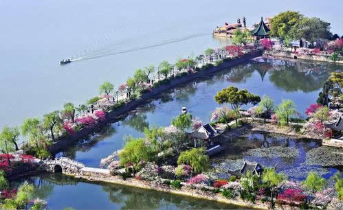 南堤春曉 四季亭南,沿湖筑大堤半圍,陽(yáng)春三月,堤上300余株垂柳,柳枝飄曳,400余株桃花競(jìng)相吐艷。一湖碧水,數(shù)峰青山,分外妖嬈。長(zhǎng)堤西南角臨湖屹立六角亭,綠瓦紅柱,亭內(nèi)12根楞木上雕有60只金鳳凰,每5只鳳凰由一條龍率領(lǐng)。正中繪以雙龍戲珠,故俗呼“龍風(fēng)亭”。亭上懸“月波平眺”額,亭旁有游船碼頭,通黿頭渚風(fēng)景區(qū)。