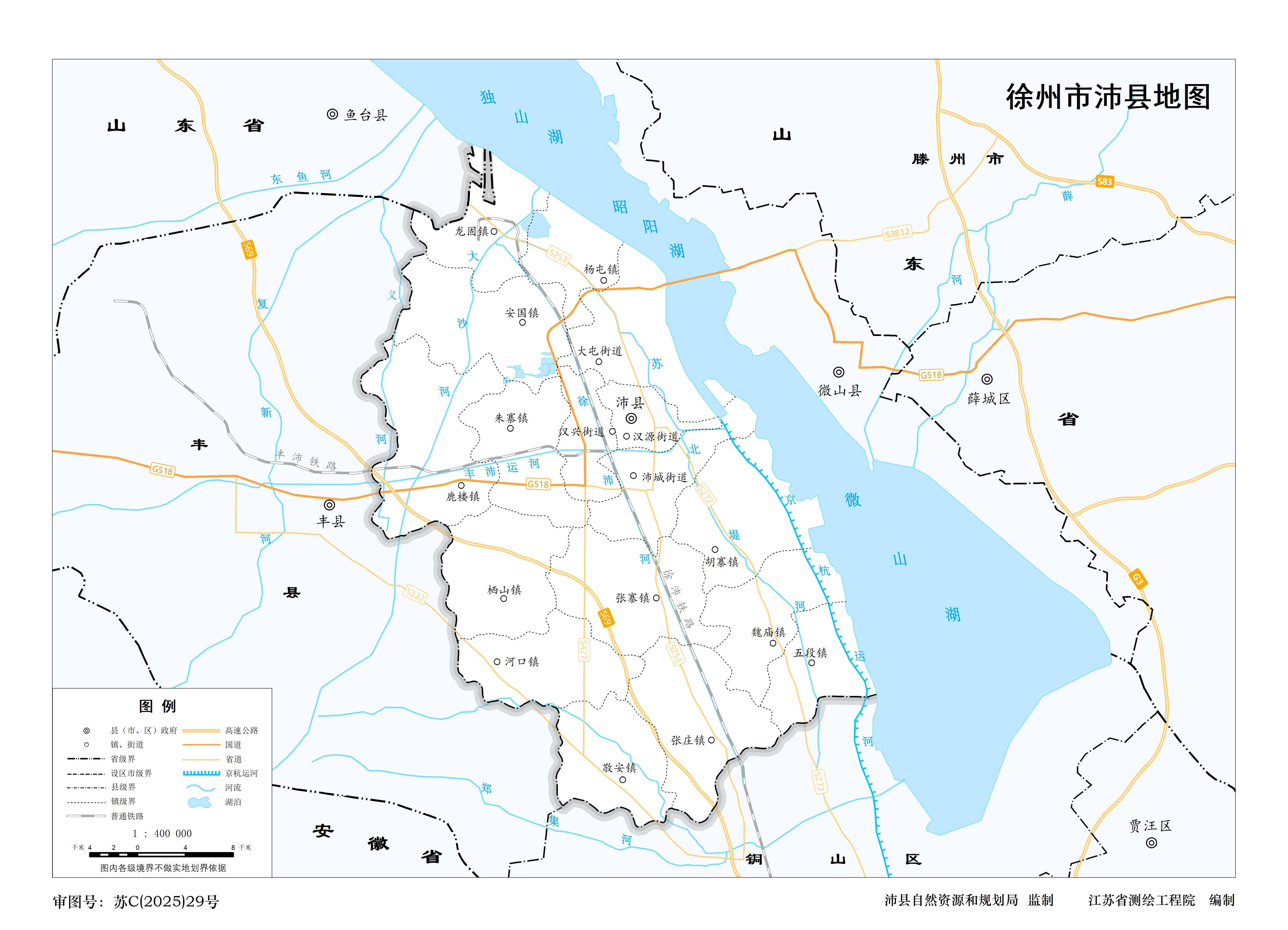 沛縣東靠微山湖、昭陽湖,與山東省微山縣毗連,西北與山東省魚臺縣接壤,西鄰豐縣,南界銅山縣。地處北緯34度28分~34度59分,東經(jīng)116度41分-117度09分,全境南北長約60公里,東西寬約30公里,總面積1576平方公里。沛縣境內(nèi)無山,全部為沖積平原,海拔由西南部的41米到東北部降至31.5米左右。境內(nèi)有9條骨干河流,屬淮河流域泗水水系中的南四湖水系。沛縣屬溫暖帶半濕潤季風氣候,冬季寒冷干燥,夏季高溫多雨,秋季天高氣爽,春季天干多變,年平均日照2307.9小時,年平均氣溫13.8度,一般年平均降水量766毫米。