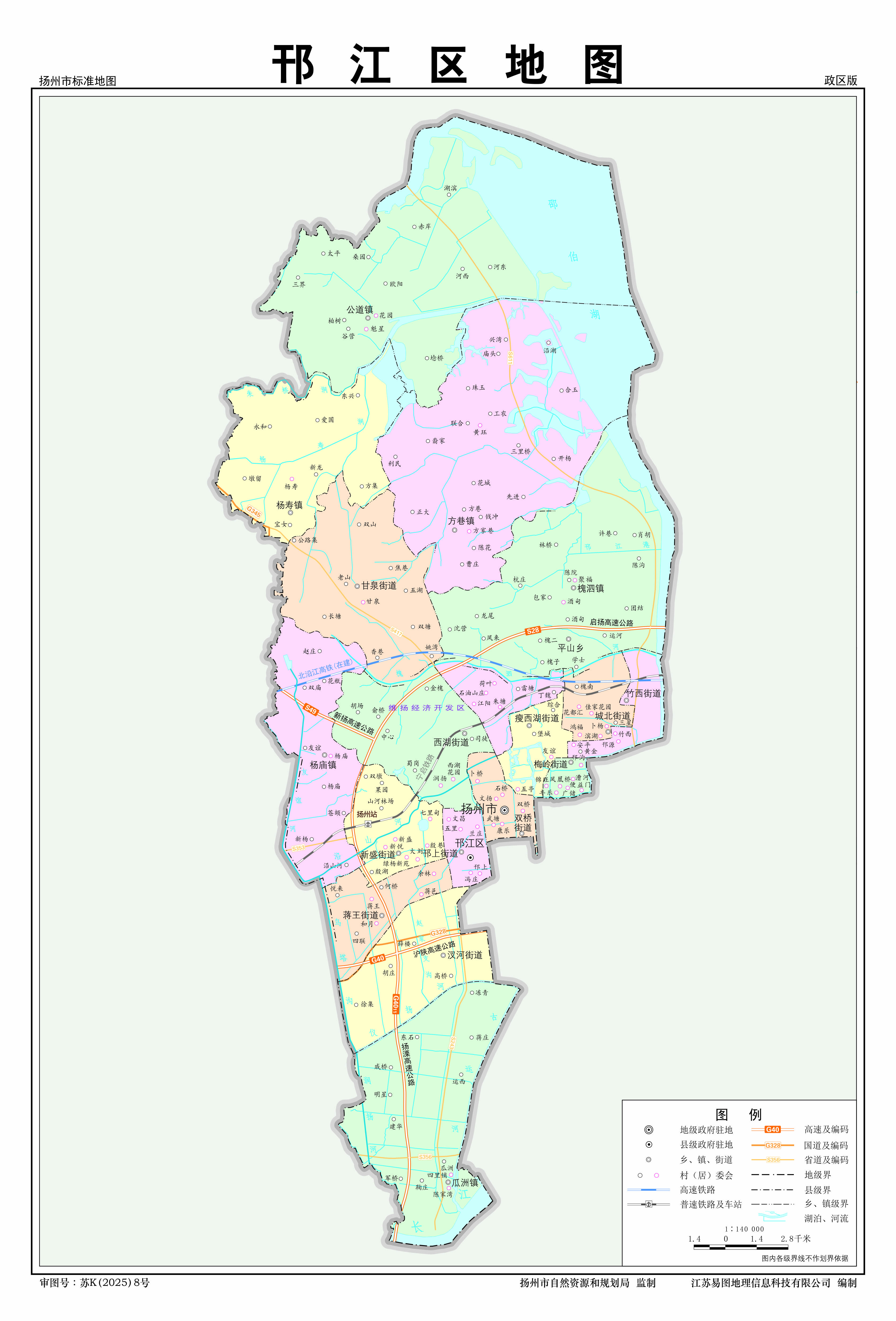 鎮(zhèn):蔣王鎮(zhèn)、汊河鎮(zhèn)、公道鎮(zhèn)、方巷鎮(zhèn)、槐泗鎮(zhèn)、瓜洲鎮(zhèn)、杭集鎮(zhèn)、李典鎮(zhèn)、沙頭鎮(zhèn)、頭橋鎮(zhèn)、泰安鎮(zhèn)、楊廟鎮(zhèn)