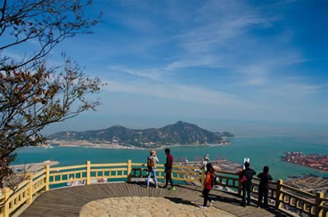 海天一覽觀景臺,建于山崖頂上。依山面海,凌空壯觀,氣勢恢宏,與懸空棧道、懸索橋、云中漫步廊橋相連,總長1180米,直通二桅尖山峰。游客在此,極目海州灣,一覽港島城,山海奇觀,盡收眼底,令人心曠神怡,流連忘返。有詩贊道:“山居有大觀,圖畫入眼簾。曠目千里遠(yuǎn),怡心數(shù)縷煙。島峰浮霧海,帆影接云天。海上長虹落,銀鷗舞蹁躚”。