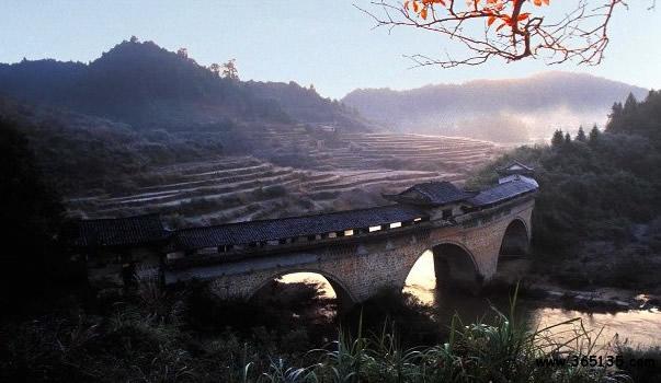 玉帶橋:因其弧形如玉帶,故名。玉帶橋?yàn)楫?dāng)?shù)馗晃逃囡L(fēng)歧募資建于清乾隆五年(公元1740年),又名“風(fēng)歧橋”。玉帶橋?yàn)槎杖孜輼鞘焦皹,橋身成弧行,橋長88.15米,是江南現(xiàn)存最長的弧形廊橋,它以結(jié)構(gòu)獨(dú)特,氣勢(shì)雄偉而聞名贛粵。留下了“遠(yuǎn)近聞名玉帶橋,兩岸峻峰入云霄。奔騰河水瀉千里,玉帶飛鎮(zhèn)兩山腰”的贊譽(yù)。