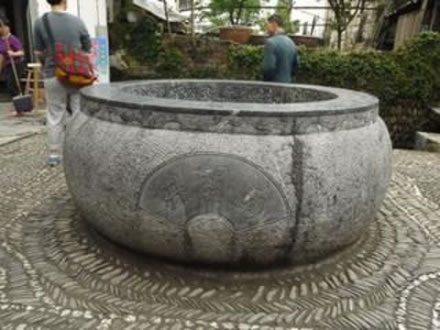 北斗七星井位于江西省上饒市婺源縣江灣鎮(zhèn)江灣景區(qū)內(nèi),北斗七星井體現(xiàn)了”天、地、人合一”的中國風水學最高原則,南側(cè)梨園河呈太極圖“S”形系。北宋初年,南唐國師何令通遭貶來到江灣靈山隱居,與蕭江六世祖江文采交往甚篤,便指引蕭江氏族人由旃坑遷居風水寶地云灣(現(xiàn)為江灣)。蕭江先祖在他的指引下,利用風水學的最高原理,對江灣的水系環(huán)境、建筑布局、街衢走向,山脈走勢等方面進行了改造。族人自遷云灣后人丁日益興旺、科第舉發(fā),其中村內(nèi)的北斗七星井便是國師運用風水學的典范。 中國古代的四個方位分別是“前朱雀后玄武、左青龍右白虎”,而江灣的地勢是玄武(后龍山)偏低,朱雀(對面攸山)偏高,朱雀屬火,也就是說南方火勢較旺,是一個較為不利的地形。當時何令通便想出在村中挖七口井,并按北斗七星狀分布,以七井之水鎮(zhèn)住攸山火勢。而北斗七星分布又是呈勺子狀的,從此,村內(nèi)即有了充足水源又有了舀水的勺子,攸山之火自然就被鎮(zhèn)住了。