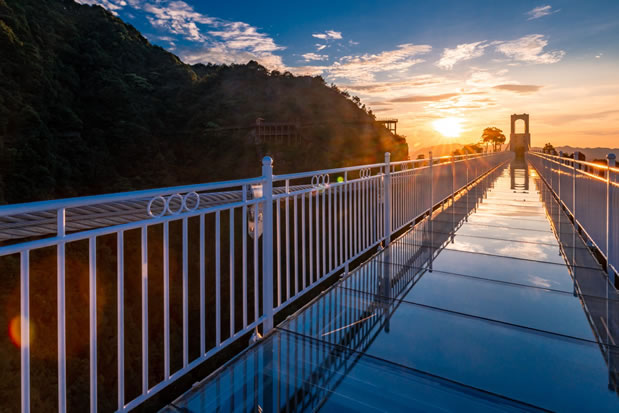 玻璃天橋,全長(zhǎng)330米,寬2.5米,最高落差198米,是目前江西最長(zhǎng)的玻璃天橋。山間云霧繚繞,橫跨兩山的玻璃橋仿佛橫架云端,恰似人間仙境。