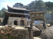 潘公廟位于海拔1557米的靈龜峰頂上。廟不大,全由花崗巖石疊砌而成,頂部廡殿式,廟宇四方形,簡單古樸。九天應元府座落于九華山東南的坡地上,是一座亭式花崗巖小廟。基高一米,中部四面通風,頂上為歇山式,造型粗獷,正面額枋上刻有“九天應元府”五字,廟內(nèi)供奉有九天應元雷聲普化天尊的石雕神像。