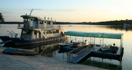 凈月潭水上游覽船舶集水上交通運輸、游覽于一體。從任何一處碼頭上船都可以通向風(fēng)景區(qū)的幾個主要景點:大壩碼頭、沙灘浴場碼頭、橡樹灣碼頭(森林浴場)、滑雪場。凈月潭現(xiàn)有兩艘主要船舶。其中“乘風(fēng)號”游船系雙層雙體燃氣環(huán)保型游覽船舶,定員 100位。游客可在乘坐游船的同時觀賞凈月潭水的秀色。而“麒龍?zhí)枴笔且凰椰F(xiàn)代船舶,客艙內(nèi)配有電視、音樂,為游客播放凈月潭相關(guān)視頻,二層甲板處更是觀光遠眺凈月風(fēng)景的好地方。凈月潭又從日本購進多輛三座位的“水上摩托艇”,速度快、較刺激,可供游客自行駕駛。由“摩托艇”牽引,游人還可踩滑水板滑翔于潭面。由“快艇”牽引,乘坐五座位的火箭沖浪艇,也極具刺激性。