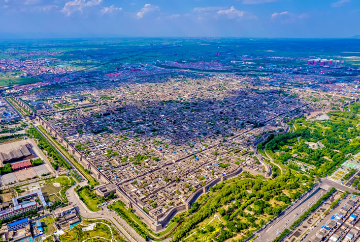 平遙古城,位于山西省中部,始建于西周宣王時期(前827年—前782年),于明代洪武三年(1370年)重建、擴修城池,是現(xiàn)今中國境內(nèi)保存最為完整的一座古代縣城,整座城池宛如烏龜向南爬行,因此有“龜城”之稱。平遙古城由城墻、店鋪、街道、寺廟、 民居等共同組成一個龐大的建筑群,整座城池對稱布局,以市樓為軸心,以南大街為軸線,形成左城隍、右衙署,左文廟、右武廟,東道觀、西寺廟的封建禮制格局,總占地面積2.25平方千米;城內(nèi)街道格局為“土”字形,整體布局遵從八卦方位,由四大街、八小巷、七十二條蚰蜒巷構(gòu)成八卦圖案,南大街、東大街、西大街、衙門街和城隍廟街形成干字型商業(yè)街。