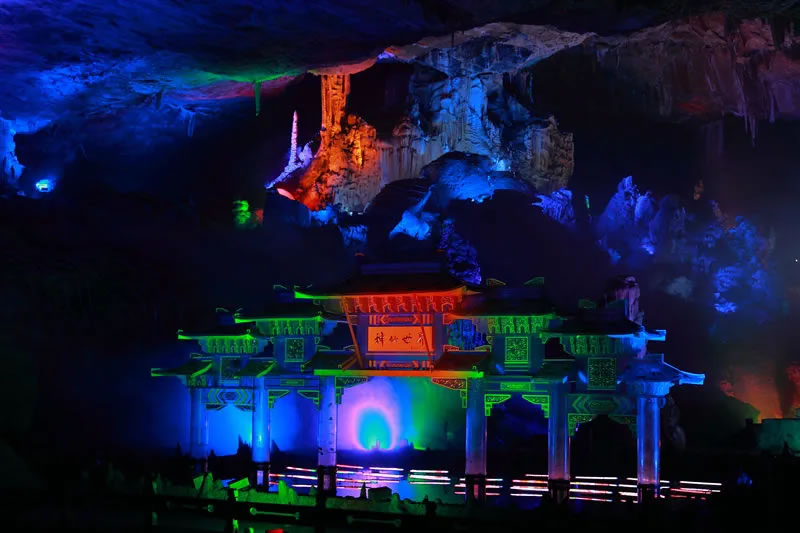 • 特色:洞內(nèi)分為七個洞廳,前四廳為自然景觀,展示石筍、石幔、石花等形態(tài)各異的鐘乳石;后三廳為人工打造的“神仙世界”游樂宮,結(jié)合聲、光、電技術(shù),展現(xiàn)奇幻的溶洞世界。