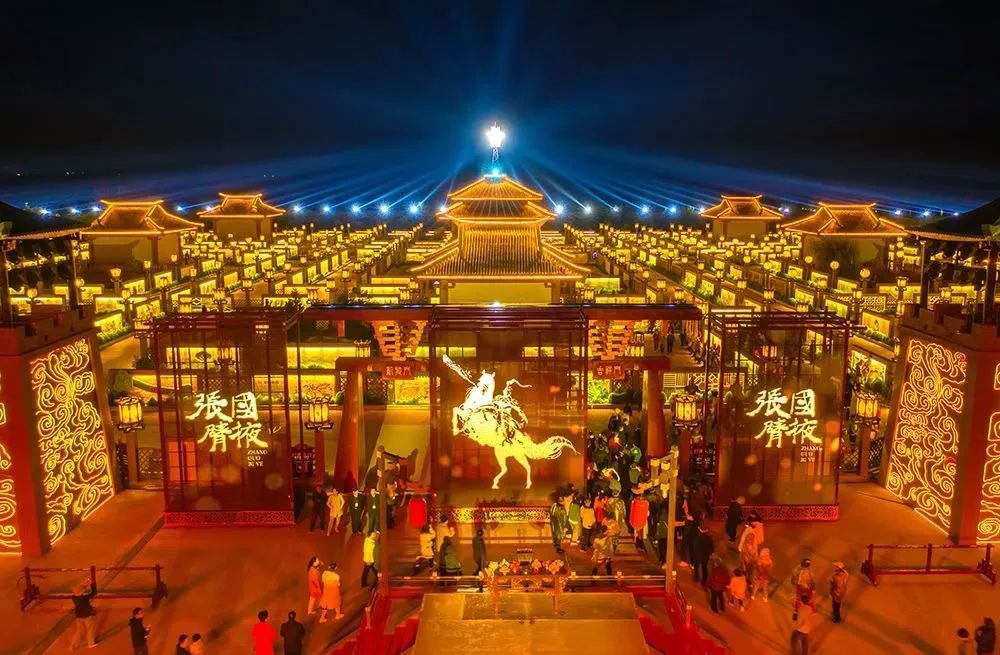 1. 九曲黃河燈陣:占地150畝,全長2.4公里,按九宮八卦布局九大殿(關(guān)公殿、元始天尊殿等),設(shè)365桿旗、365盞燈對應(yīng)全年天數(shù),700余面文化墻融合二十四節(jié)氣、十二生肖、二十八星宿等傳統(tǒng)文化元素,夜間燈光秀與實(shí)景演藝《張國臂掖》結(jié)合,打造沉浸式漢唐市井體驗(yàn)。