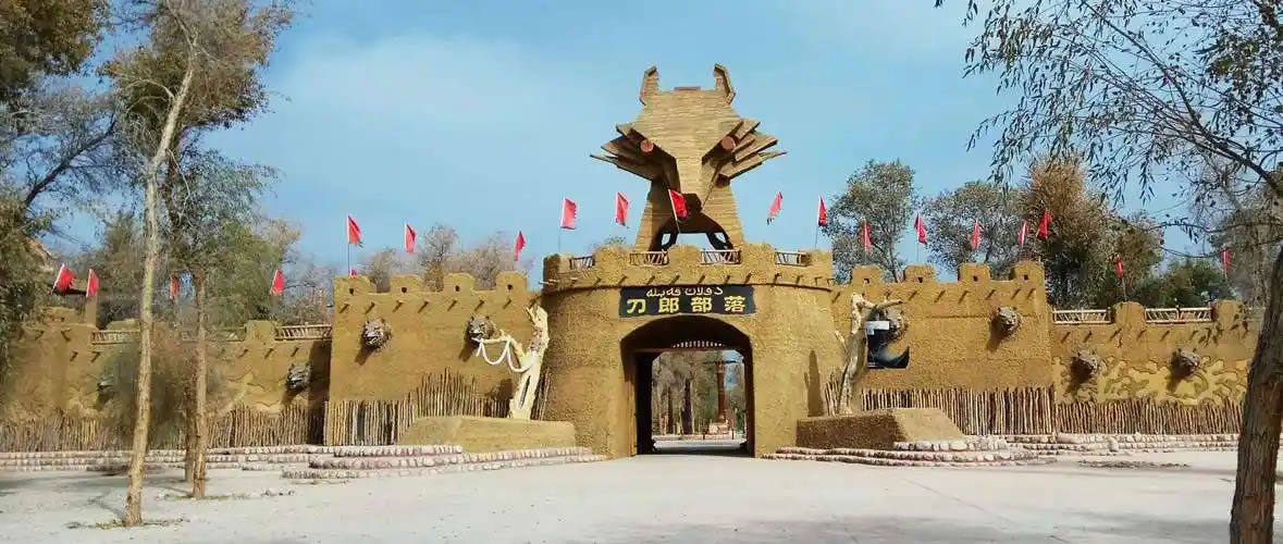 刀郎部落,位于新疆維吾爾自治區(qū)阿克蘇地區(qū)阿瓦提縣玉滿閘口胡楊林區(qū),距阿克蘇市58公里、縣城18公里,占地面積8300畝。景區(qū)以5000余畝千年原始胡楊林為生態(tài)背景,完整呈現(xiàn)刀郎人建筑、飲食及民俗文化,集中展示刀郎木卡姆、刀郎麥西熱甫等8項(xiàng)國(guó)家級(jí)和自治區(qū)級(jí)非物質(zhì)文化遺產(chǎn),其中“刀郎演唱組合”保持著最大年齡民間歌舞組合的大世界基尼斯紀(jì)錄。核心功能區(qū)包含民俗展館、千年胡楊區(qū)、鴕鳥養(yǎng)殖園區(qū)等七大板塊,復(fù)原刀郎人傳統(tǒng)居所與勞作工具,設(shè)有傳統(tǒng)手工藝作坊和勇士競(jìng)技場(chǎng),每日開展刀郎麥西熱甫展演、民俗婚禮體驗(yàn)及摔跤、叼羊等傳統(tǒng)體育活動(dòng)。2025年入選非遺進(jìn)景區(qū)“五好”案例名單,通過非遺傳承人駐場(chǎng)表演、慕薩萊思釀造工藝展示及沙雕主題公園等特色項(xiàng)目,形成生態(tài)觀光與民俗體驗(yàn)深度融合的旅游模式。景區(qū)內(nèi)保留狩獵場(chǎng)景、農(nóng)民畫長(zhǎng)廊及高空輪轉(zhuǎn)秋千表演,配套沉浸式互動(dòng)體驗(yàn)和文創(chuàng)開發(fā)體系,實(shí)現(xiàn)刀郎文化的活態(tài)傳承。