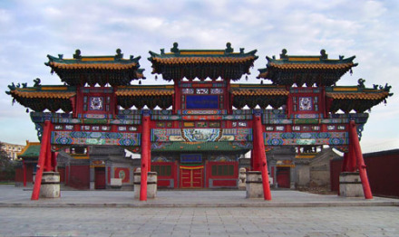 大召,明代稱“弘慈寺”,歷史上又有“銀佛寺”“大乘法輪召”“甘珠爾廟”“帝廟”等多種稱謂。大召,是一座大藏傳佛教寺院,是呼和浩特最早建成的黃教寺院,也是蒙古地區(qū)僅晚于美岱召的蒙古人皈依黃教初期所建的大型寺院之一,屬于格魯派(黃教)。占地面積約3萬(wàn)平方米,其中建筑面積為8000多平方米。大召寺院座北向南,總體布局是伽藍(lán)七堂形制,由正院、東倉(cāng)和西倉(cāng)三大院落單位成,東西兩倉(cāng)各有倉(cāng)門,北端互通構(gòu)成環(huán)繞寺廟的甬道。主軸線上由山門、天王殿、菩提過殿、大雄寶殿和九間樓組成。大召的藏品豐富,堪稱大召“三絕”的銀佛、龍雕、壁畫佛殿內(nèi)的各種彩塑、金銅造像、晾佛節(jié)展開的巨幅唐卡、108部的甘珠爾經(jīng)卷,以及宗教活動(dòng)使用的各種法器,面具等都是較珍貴的歷史文物和藝術(shù)珍品。