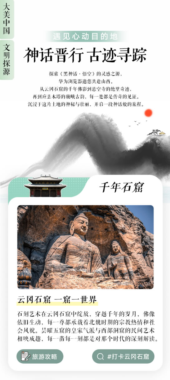 華為瀏覽器的“遇見心動目的地”專題還將于9月29日上線大美中國、文明探源、神話晉行專題,包括大同懸空寺、朔州崇福寺、應(yīng)縣木塔、臨汾鐵佛寺等《黑神話:悟空》游戲中的取景地都會有相應(yīng)的旅游攻略。專題會根據(jù)旅游的目的地和路線的不同,提供多種不同的行程方案,可以根據(jù)自身的實際情況進行挑選,讓我們的旅程變得無比充實!