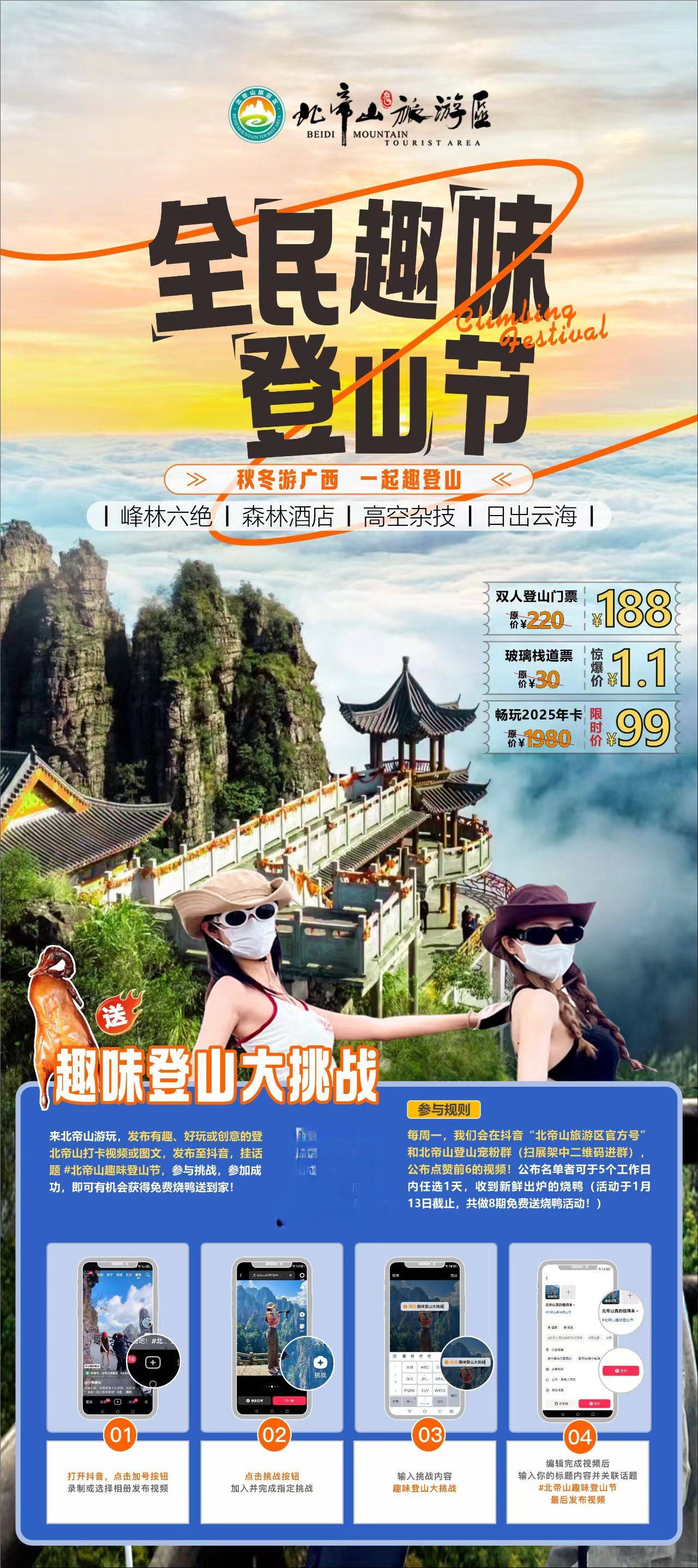 北帝山喊你來打卡!把你的鏡頭對準(zhǔn)北帝山,無論是打卡的、炫酷的、或搞笑的,只你大膽曬出來!發(fā)布至抖音,參加趣味登山大挑戰(zhàn)掛話題#北帝山趣味登山節(jié),即可參加成功贏免費燒鴨送到家!