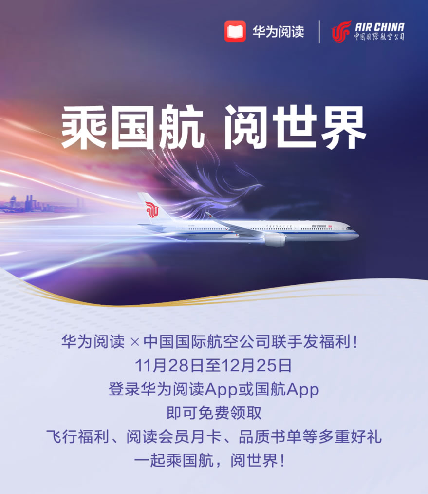 為了豐富旅客的飛行時(shí)光,近日華為閱讀與中國國際航空公司攜手,正式啟動(dòng)了“乘國航 閱世界”國航伴讀計(jì)劃,該計(jì)劃通過整合華為閱讀的豐富資源與國航的全球航線網(wǎng)絡(luò),為用戶打造一個(gè)旅行中的高品質(zhì)閱讀空間。參與此次活動(dòng)的用戶將可免費(fèi)領(lǐng)取3重好禮!包含了國航用戶多重福利、30天華為閱讀會(huì)員、精選國航伴讀書單,帶旅客悅享旅途的美好。