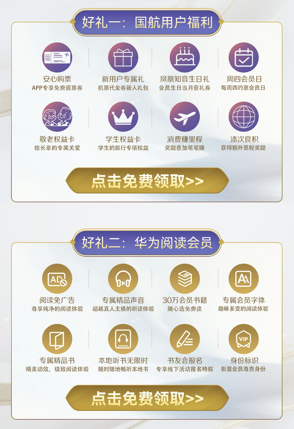 本次活動(dòng)中,國航為用戶提供了退票券、生日禮、敬老權(quán)益卡、學(xué)生權(quán)益、新人專屬禮券等一系列大禮包。華為閱讀則為國航的用戶提供了30天閱讀會(huì)員的專屬福利!領(lǐng)取后可以享受超百家知名出版社30萬冊版權(quán)會(huì)員書籍免費(fèi)讀,不僅可以免費(fèi)使用專屬會(huì)員字體閱讀,還能獲得免廣告的純凈體驗(yàn)。同時(shí),喜愛聽書的用戶還可以使用專屬的精品聲音聽書,本地聽書無限時(shí),加入書架的書籍還內(nèi)置了專屬精品聲音,給用戶帶來超越真人主播的聽讀體驗(yàn)。華為閱讀還會(huì)定期組織線下書友會(huì),領(lǐng)取會(huì)員后可專享書友會(huì)優(yōu)先報(bào)名特權(quán)!