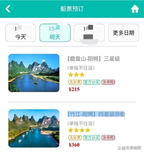 進(jìn)一步來(lái)看,漓江風(fēng)景區(qū)船票購(gòu)買界面提供的215元的“【磨盤(pán)山-陽(yáng)朔】三星級(jí)”和360元的“【竹江-陽(yáng)朔】四星級(jí)游船”選項(xiàng)中,雖然顯示“含保險(xiǎn)”,但并未說(shuō)明保費(fèi)與承保的保險(xiǎn)公司,乃至保障責(zé)任等信息。