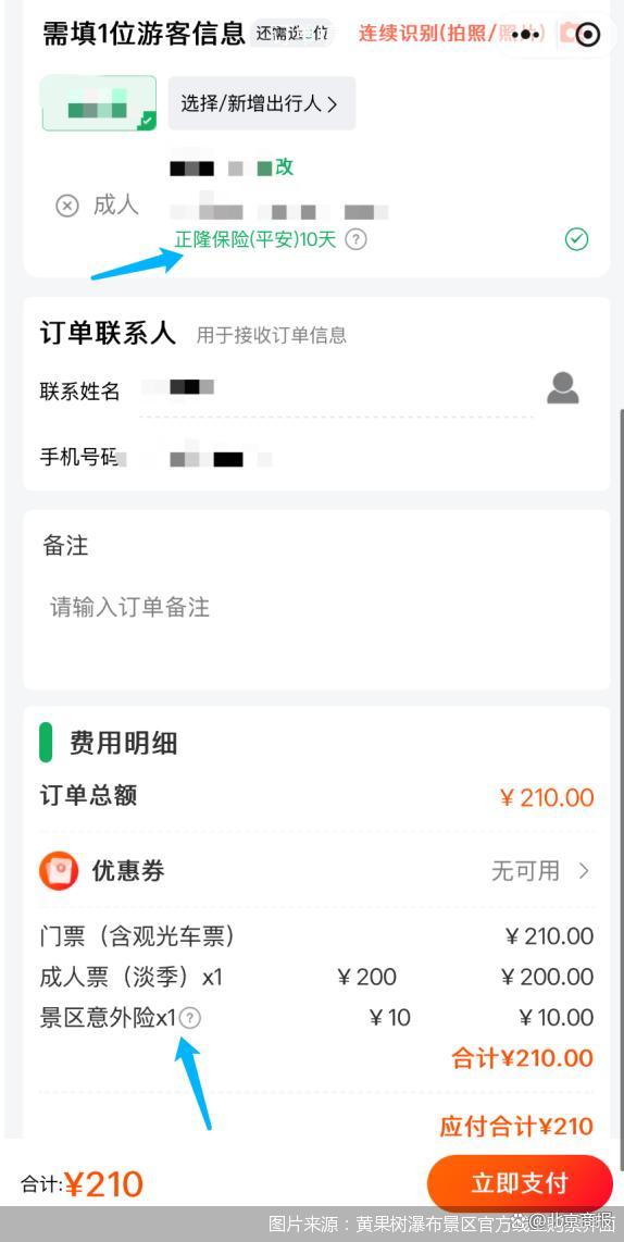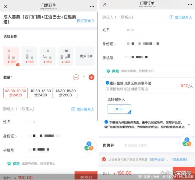 比如,游客在黃果樹(shù)瀑布景區(qū)官方線上渠道購(gòu)票時(shí),在提交訂單界面,會(huì)捆綁有一份“景區(qū)意外險(xiǎn)”,顯示為10元。當(dāng)記者填寫(xiě)完身份信息后,在身份信息旁會(huì)出現(xiàn)“正隆保險(xiǎn)(平安)10天”字樣,并且進(jìn)行了默認(rèn)勾選,如果不需要購(gòu)買保險(xiǎn),則需要取消該選項(xiàng)的勾選。