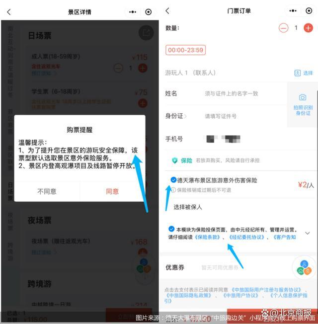 廣西德天大瀑布景區(qū)的官方線上購(gòu)票渠道在選擇“日?qǐng)銎?rdquo;(成人票)后,會(huì)提示“為了提升您在景區(qū)的游玩安全保障,該票型默認(rèn)選取景區(qū)意外保險(xiǎn)服務(wù)”。進(jìn)一步來(lái)看,該景區(qū)默認(rèn)勾選的保險(xiǎn)為“德天瀑布景區(qū)旅游意外傷害保險(xiǎn)”,并在保險(xiǎn)名稱下方標(biāo)有“本模塊為保險(xiǎn)投保界面,由中元經(jīng)紀(jì)所有、管理并運(yùn)營(yíng)”。