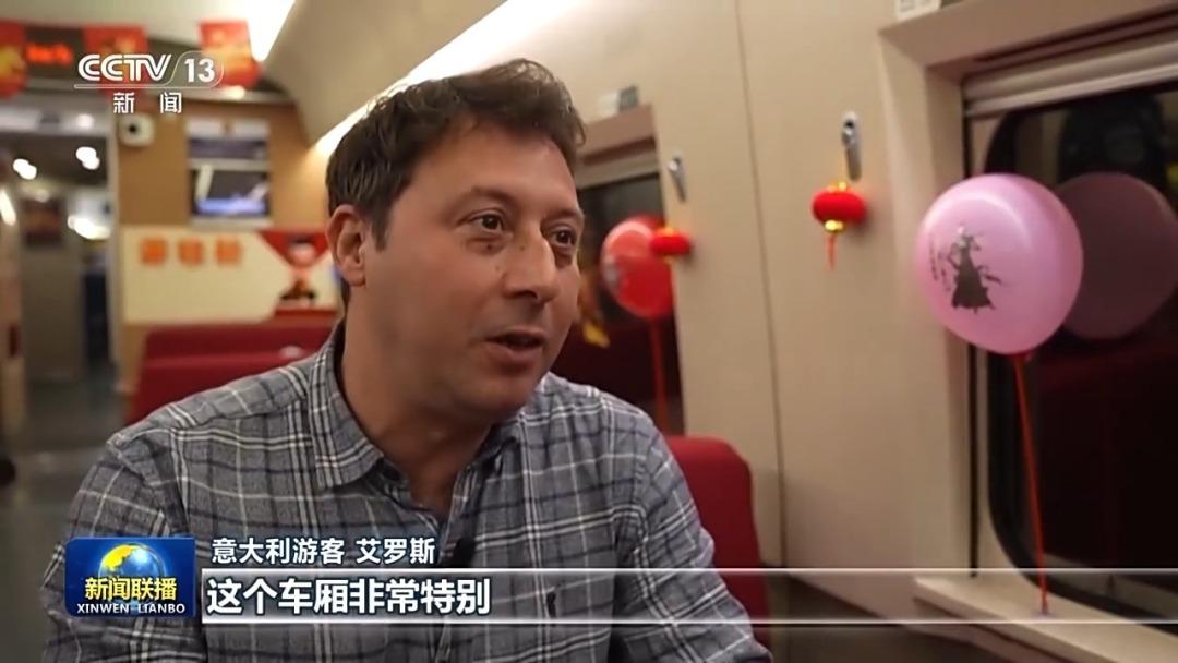 意大利游客 艾羅斯:這個車廂非常特別,我們知道這段時間哪吒的話題非常流行,大家都很喜歡這部電影。在體驗(yàn)中國高鐵速度的同時,這也是一種很好的旅行方式,這非常好。