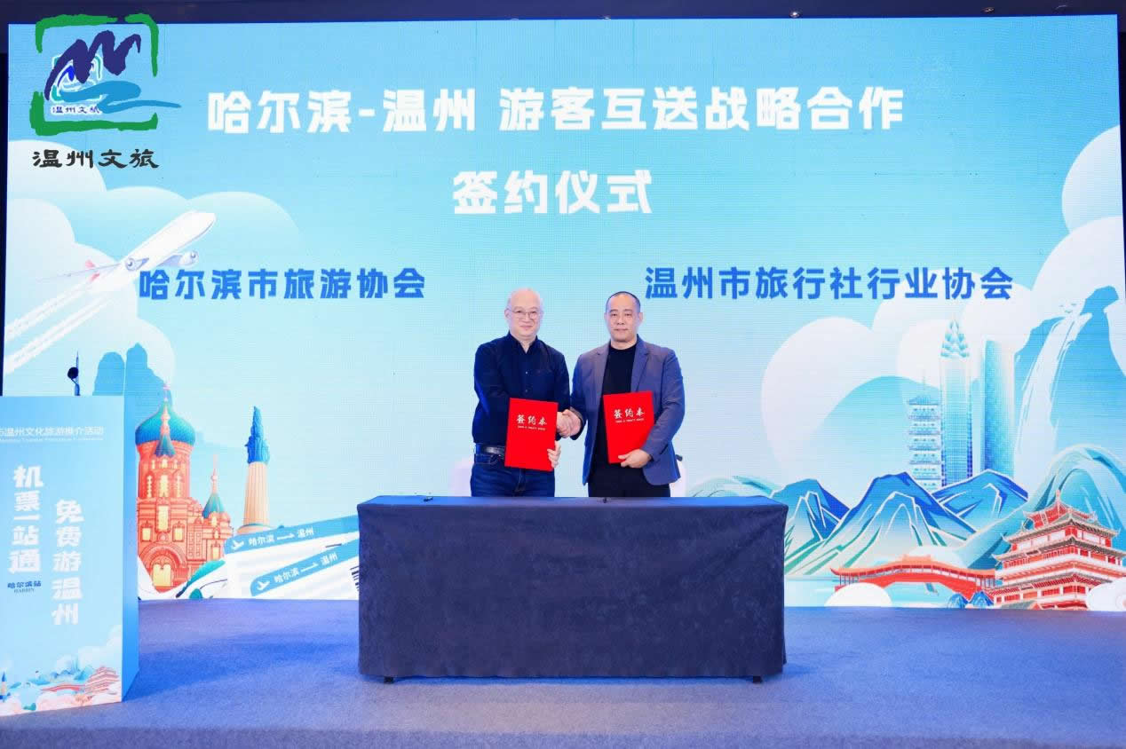 活動現(xiàn)場重點推介了“‘山江海’暢游之旅”“都市休閑美食體驗之旅”“文成泰順康養(yǎng)游”三大主題線路,并重磅推出“一張機票游溫州”政策:憑抵溫機票可7日內(nèi)可享受國有旅游景區(qū)首道門票免費和部分私營景區(qū)優(yōu)惠權益。除了鼓勵旅行社招徠境內(nèi)游客、港澳臺及境外游客,招徠大型團隊以及療休養(yǎng)團隊,部分縣市區(qū)、景區(qū)也針對旅行社市場推廣做出疊加獎勵,真正實現(xiàn)“一票多惠”,為沈陽市民提供高性價比出游選擇。為深化兩地合作,哈爾濱市旅游協(xié)會和溫州市旅行社行業(yè)協(xié)會共同簽署“機票一站通 免費游溫州”哈爾濱-溫州互送游客戰(zhàn)略合作協(xié)議。