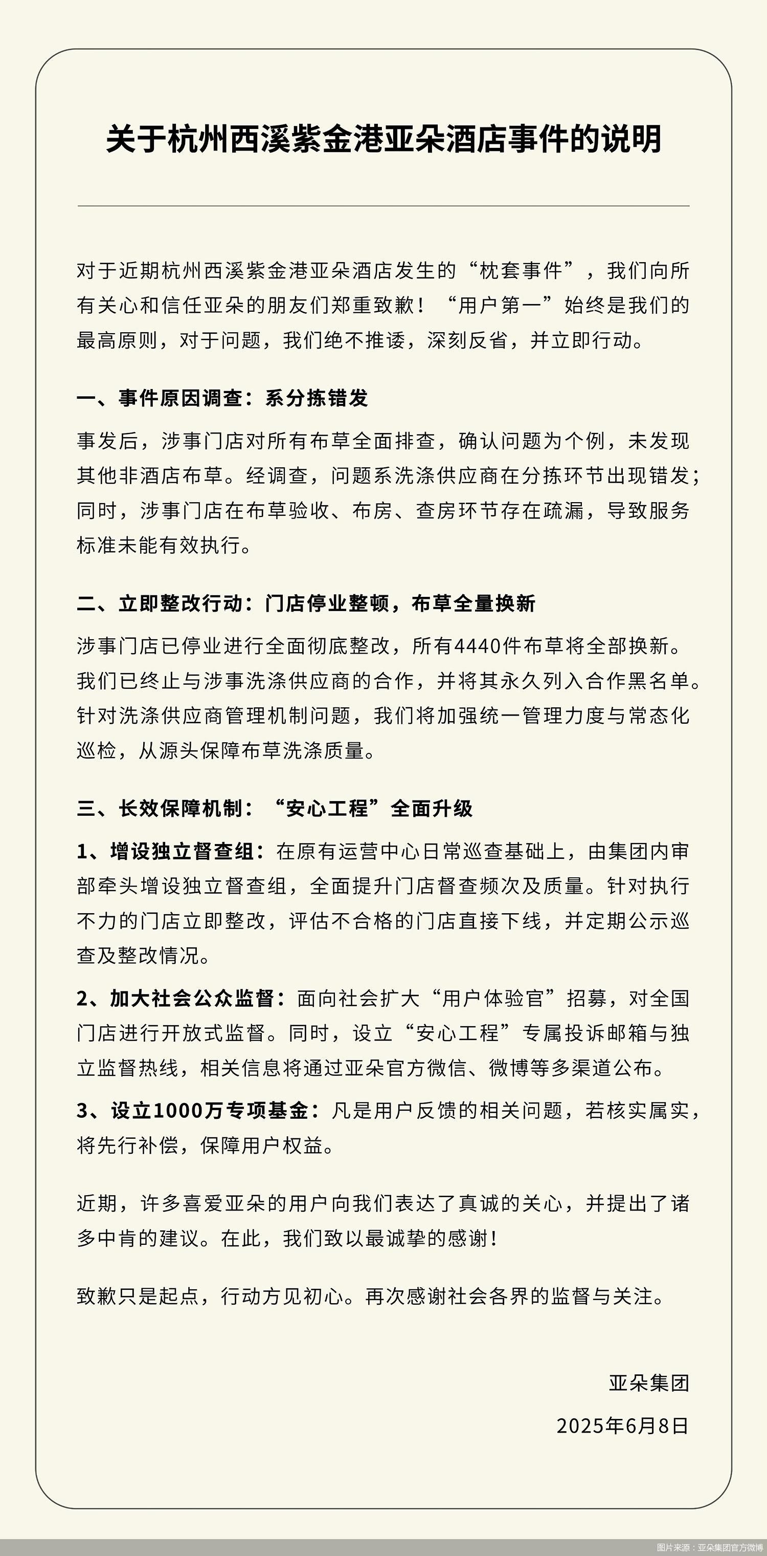 6月8日,據(jù)“亞朵集團(tuán)”官方微博消息,亞朵集團(tuán)發(fā)布關(guān)于杭州西溪紫金港亞朵酒店事件的說明,對于近期杭州西溪紫金港亞朵酒店發(fā)生的“枕套事件”,亞朵集團(tuán)向所有關(guān)心和信任亞朵的朋友們鄭重致歉。事發(fā)后,涉事門店對所有布草全面排查,確認(rèn)問題為個例,未發(fā)現(xiàn)其他非酒店布草。經(jīng)調(diào)查,問題系洗滌供應(yīng)商在分揀環(huán)節(jié)出現(xiàn)錯發(fā);同時,涉事門店在布草驗(yàn)收、布房、查房環(huán)節(jié)存在疏漏,導(dǎo)致服務(wù)標(biāo)準(zhǔn)未能有效執(zhí)行。