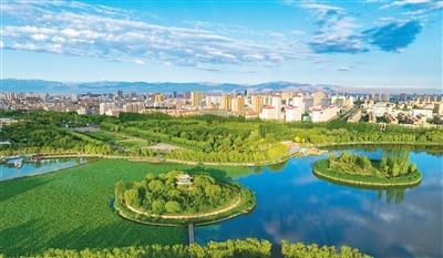 雨后初晴的甘肅省張掖國(guó)家濕地公園碧水藍(lán)天,綠意盎然,景美如畫。
