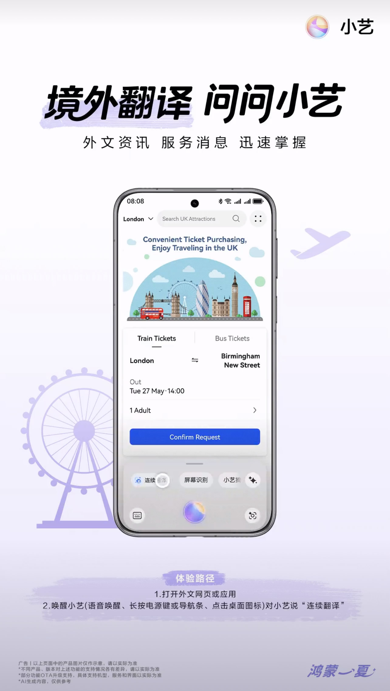 境外游時(shí),難免遇到瀏覽當(dāng)?shù)鼐W(wǎng)站訂票、打車時(shí)卻發(fā)現(xiàn)根本看不懂的麻煩。升級(jí)到鴻蒙 5.1的用戶這時(shí)就可以用小藝“連續(xù)翻譯”功能解決。長按小藝導(dǎo)航條,點(diǎn)擊“連續(xù)翻譯”服務(wù)即可體驗(yàn),一次開啟就能實(shí)現(xiàn)屏內(nèi)邊瀏覽邊翻譯的系統(tǒng)級(jí)連續(xù)翻譯體驗(yàn),支持截屏、文檔、瀏覽器等全場景的連續(xù)性翻譯。
