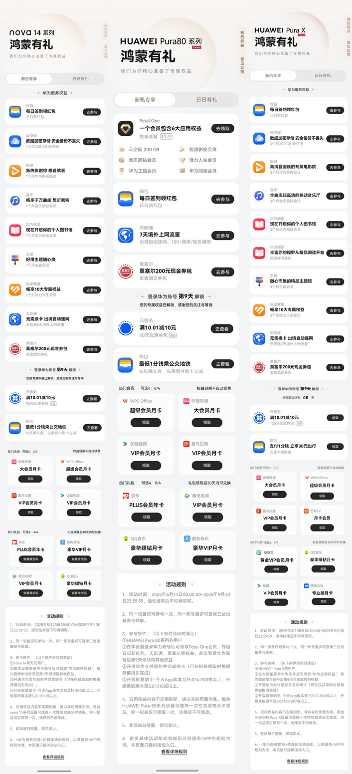 暑期,華為“負一屏”還上線了“鴻蒙有禮”權(quán)益禮包,覆蓋影視娛樂、旅行交通、外賣餐飲等多重場景,為用戶帶來更便捷、更優(yōu)惠、更智慧的暑期生活服務(wù)。購買Pura X、nova 14系列及Pura 80的新用戶還有額外的“新機專享”禮包。喚醒小藝說:“幫我領(lǐng)鴻蒙有禮”也能跳轉(zhuǎn)領(lǐng)取。